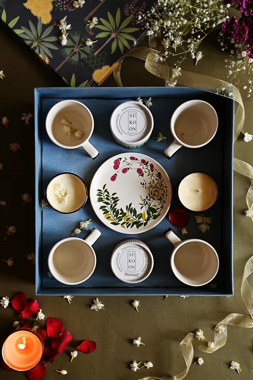 Elevate your tea-time ritual with the SUKOON Ceramic TeaΒ Gift Set. This exquisite hamper features beautifully crafted ceramic cups, a matching floral plate, artisanal jasmine tea, and soothing scented β all arranged in a premium designer box. Perfect for gifting or personal indulgence.