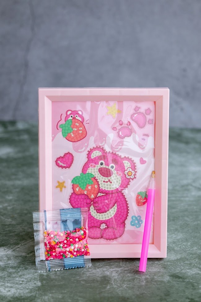 A charming Sweet Bear Diamond Kit starring a lovable pink bear clutching a juicy strawberry. Perfect for young crafters and sparkle‑art fans alike, this set offers a delightful, hands‑on activity with a framed masterpiece ready to cherish or gift!